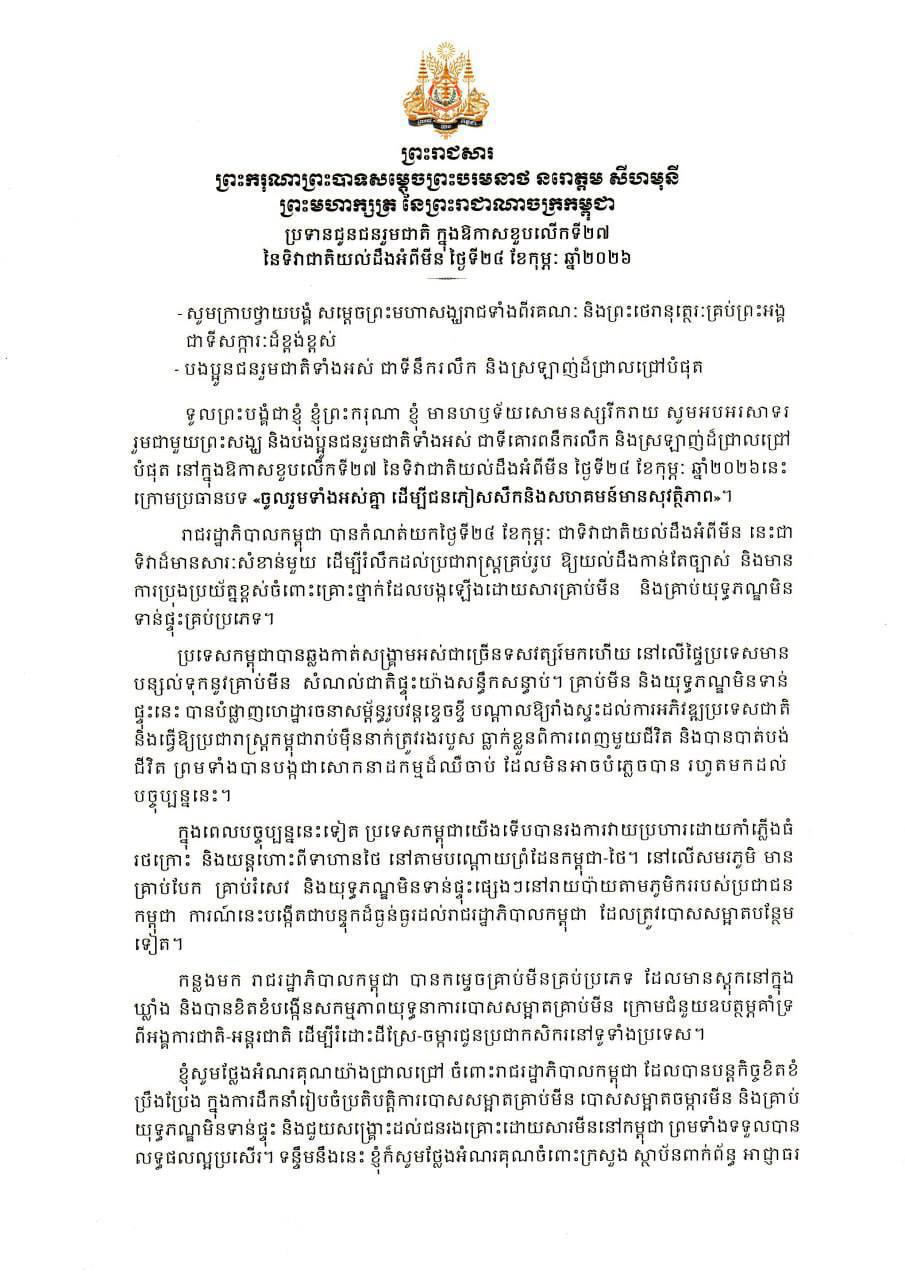 In a royal message marking the 27th National Mine Awareness Day on Feb. 24, the monarch said landmines and explosive remnants of war remain a serious danger decades after Cambodia’s prolonged civil conflicts.