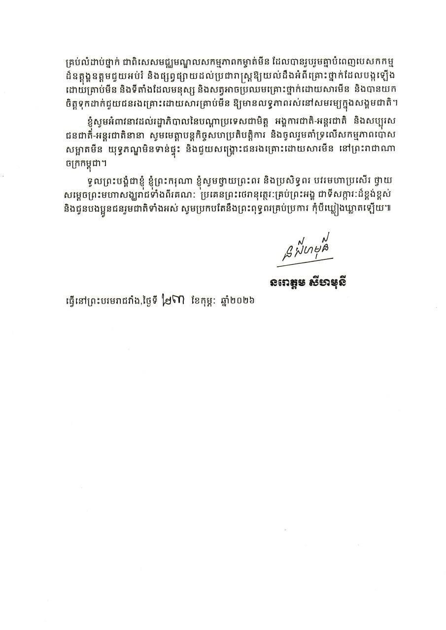 PHNOM PENH, Feb 23, 2026 — Cambodia’s King Norodom Sihamoni on Monday called for sustained national and international efforts to eliminate landmines and unexploded ordnance (UXO), warning that the deadly remnants of past conflicts continue to threaten lives and development.