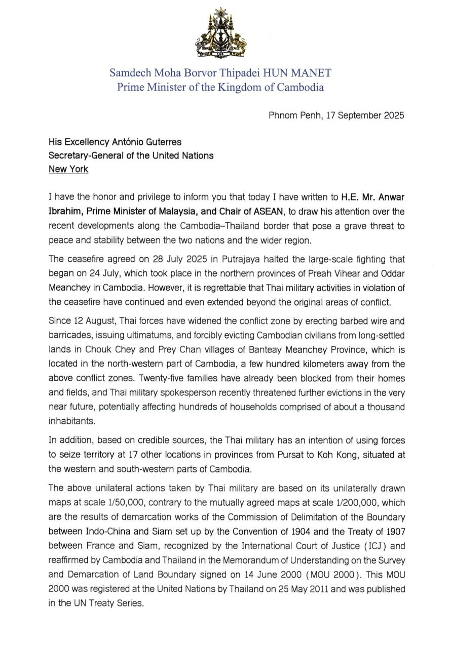 Phnom Penh, 17 September 2025 — Cambodian Prime Minister Samdech Moha Borvor Thipadei Hun Manet has written to United Nations Secretary-General António Guterres, raising urgent concerns over escalating Thai military actions along the Cambodia-Thailand border, which he described as a “grave threat to peace and stability” in the region.