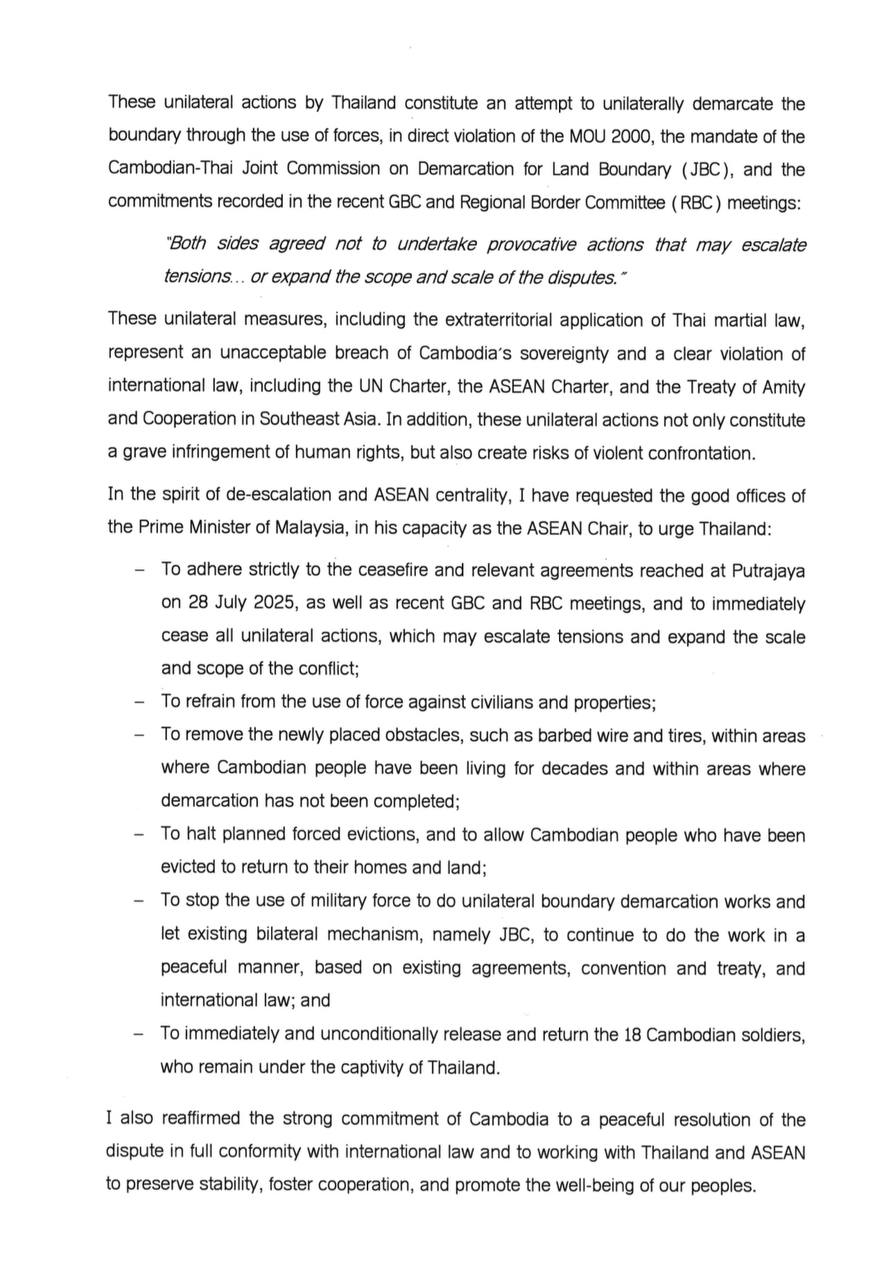 These unilateral measures, including the extraterritorial application of Thai martial law, represent an unacceptable breach of Cambodia’s sovereignty and a clear violation of international law, including the UN Charter, the ASEAN Charter, and the Treaty of Amity and Cooperation in Southeast Asia. In addition, these unilateral actions not only constitute a grave infringement of human rights, but also create risks of violent confrontation. In the spirit of de-escalation and ASEAN centrality, I have requested the good offices of the Prime Minister of Malaysia, in his capacity as the ASEAN Chair, to urge Thailand: