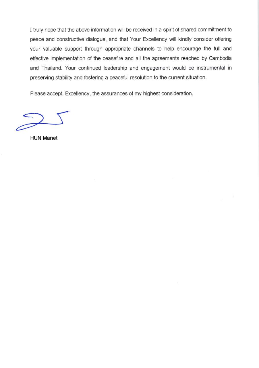 I truly hope that the above information will be received in a spirit of shared commitment to peace and constructive dialogue, and that Your Excellency will kindly consider offering your valuable support through appropriate channels to help encourage the full and effective implementation of the ceasefire and all the agreements reached by Cambodia and Thailand. Your continued leadership and engagement would be instrumental in preserving stability and fostering a peaceful resolution to the current situation.