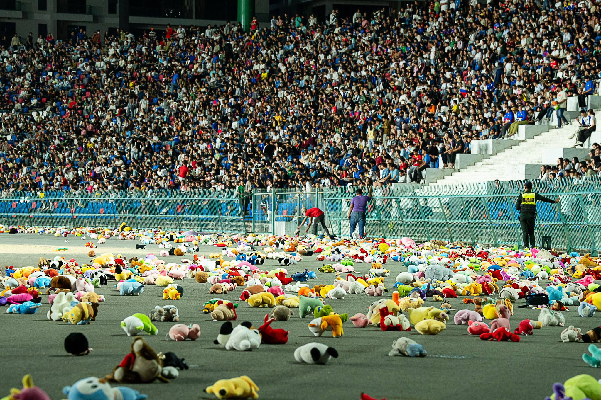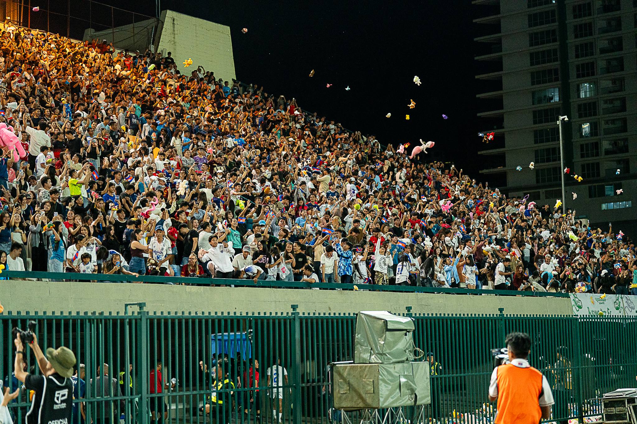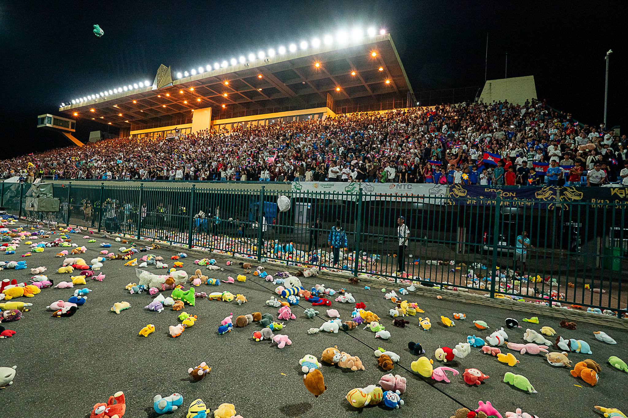 Fans brought toys to the stadium and threw them onto the field, where they were collected by organizers. The toys will be distributed to Cambodian children displaced by recent conflicts, providing comfort and support to those living in temporary shelters.