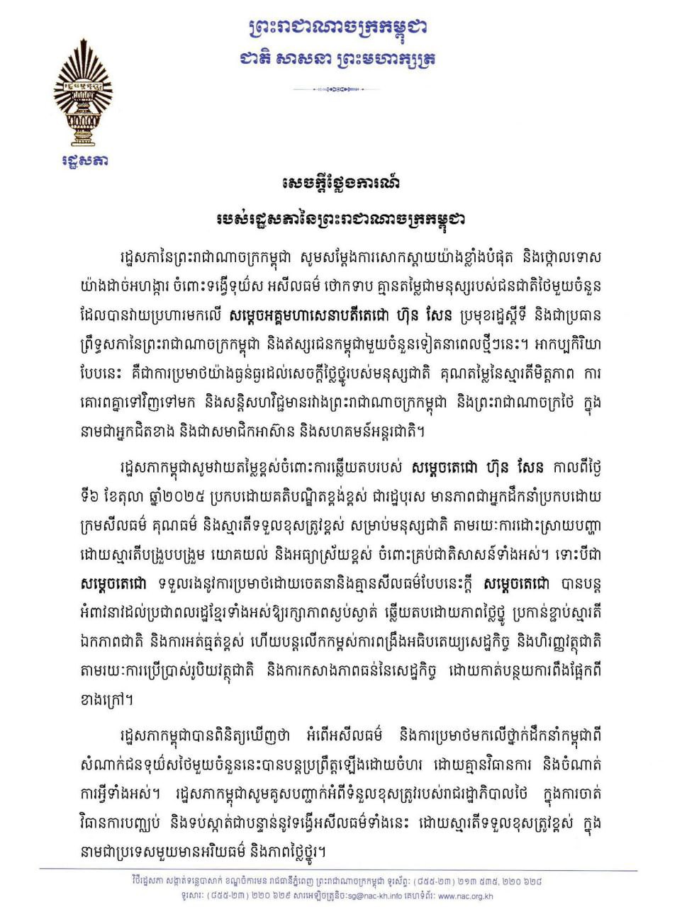 According to the statement, such behavior constitutes a serious insult to human dignity, moral values, mutual respect, and the spirit of friendship and peaceful coexistence between the Kingdom of Cambodia and the Kingdom of Thailand — as neighboring countries and members of ASEAN and the international community.