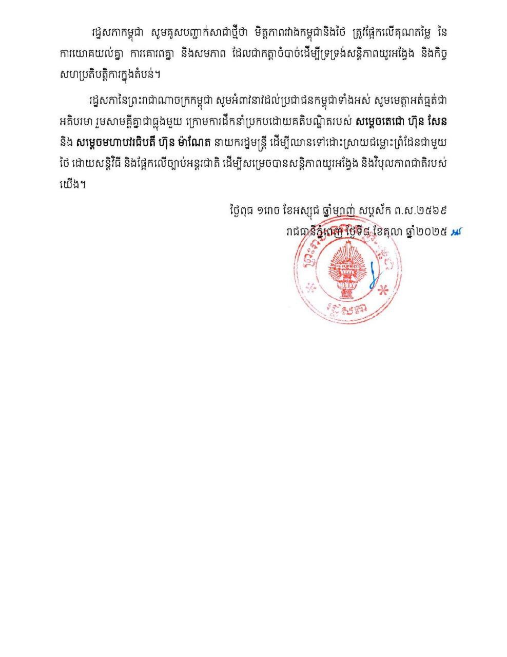 The National Assembly further observed that such unethical and insulting behavior against Cambodian leadership by a small group of ill-intentioned individuals has continued openly and without consequence. Therefore, the National Assembly of Cambodia calls upon the Government of Thailand to take immediate and effective measures to prevent and halt these indecent acts, in a manner befitting a civilized and dignified nation that upholds moral responsibility and good neighborliness.