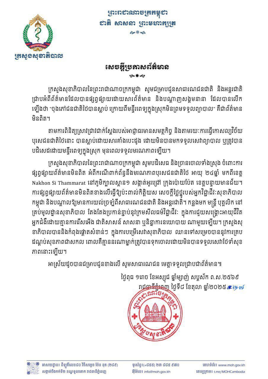 In a press statement issued today, the Ministry clarified that such reports are false and misleading. A thorough investigation by the competent authorities, including an official autopsy, confirmed that the 24-year-old Thai national from Nakhon Si Thammarat Province died of a heart attack and was never denied treatment by any hospital in Poipet City, Banteay Meanchey Province.