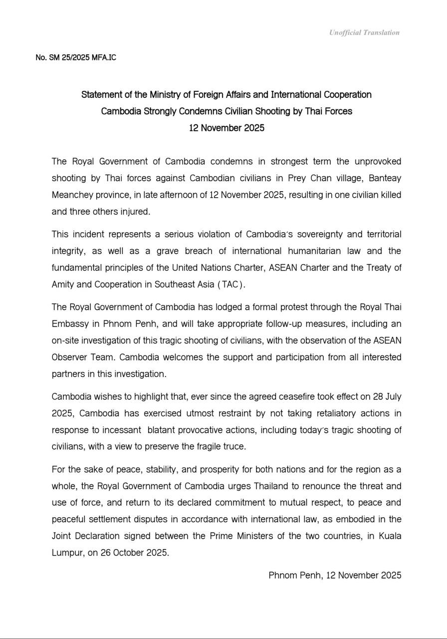 Phnom Penh, 12 November 2025 — The Royal Government of Cambodia has issued a strong condemnation following an unprovoked shooting by Thai military forces against Cambodian civilians in Prey Chan village, Banteay Meanchey province, in the late afternoon of 12 November 2025, which tragically resulted in one death and three injuries.