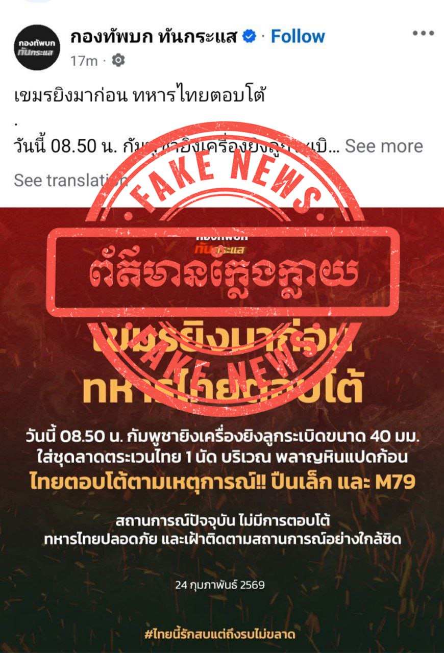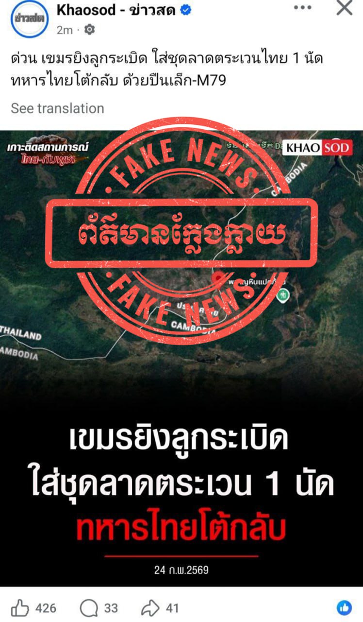 PHNOM PENH, Feb 24, 2026 — Cambodia on Tuesday denied Thai media reports alleging that its forces fired a 40mm grenade launcher round near a Thai patrol point along the disputed border in Preah Vihear province.