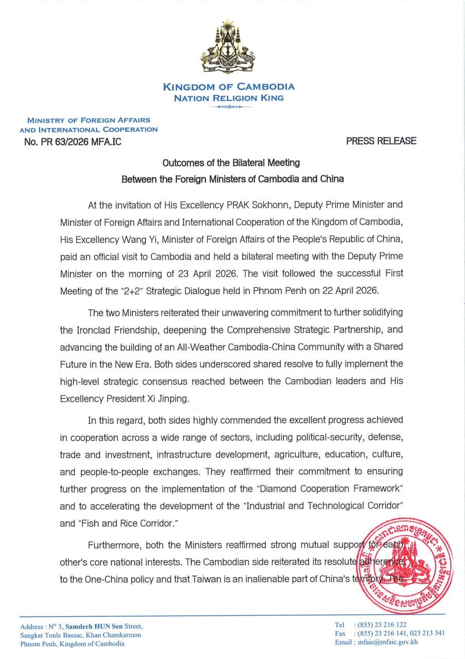Cambodia reaffirmed its adherence to the One-China policy, while Beijing reiterated its support for Cambodia’s sovereignty and national interests.