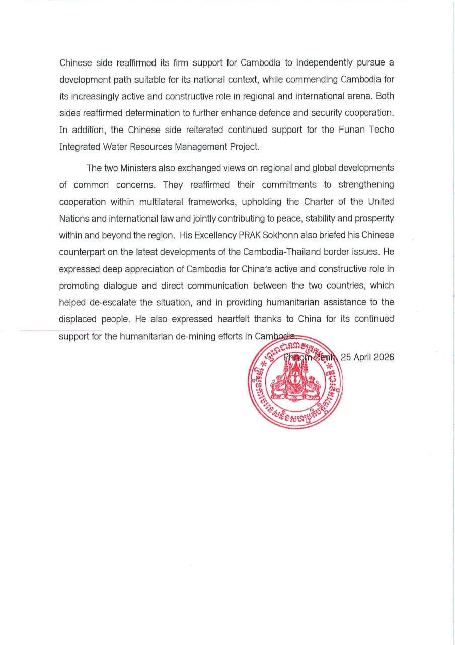 PHNOM PENH, April 29, 2026 — China has reaffirmed its support for Cambodia’s planned Funan Techo canal, underscoring deepening bilateral ties following high-level talks between the two countries’ foreign ministers, according to an official statement.