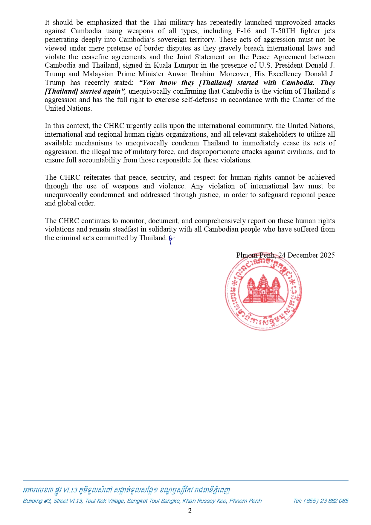 Phnom Penh, 24 December 2025 — The Cambodian Human Rights Committee (CHRC) has issued a strongly worded statement vehemently condemning Thailand’s continued and intensified military attacks against Cambodia, asserting that these actions constitute the Crime of Aggression, War Crimes, Crimes Against Humanity, and serious violations of international human rights and humanitarian law.