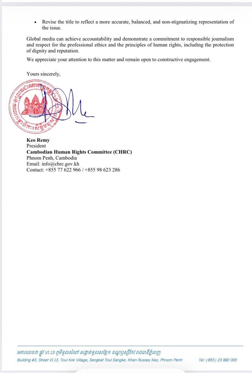 In a letter dated April 22 and addressed to Editor-in-Chief Emma Tucker, the Cambodian Human Rights Committee said it respected press freedom but was compelled to express “serious concerns” over the wording used in the article titled “How Cybercrime Became a Leading Industry in Scambodia”.