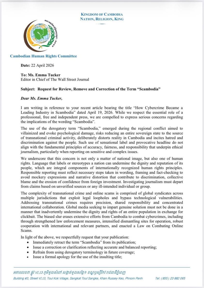 PHNOM PENH, April 22, 2026 — Cambodia’s national human rights body has formally asked The Wall Street Journal to retract and correct its use of the term “Scambodia” in a recent article on cybercrime, calling the phrase derogatory, inaccurate and harmful to the dignity of the Cambodian people.