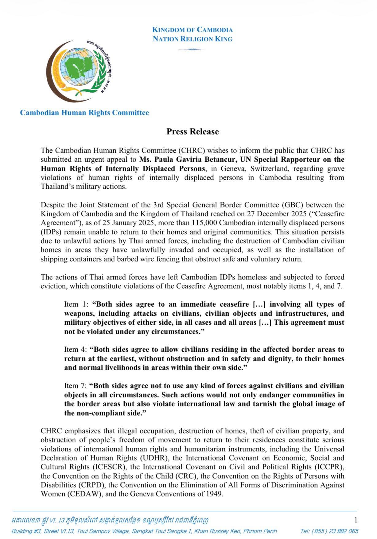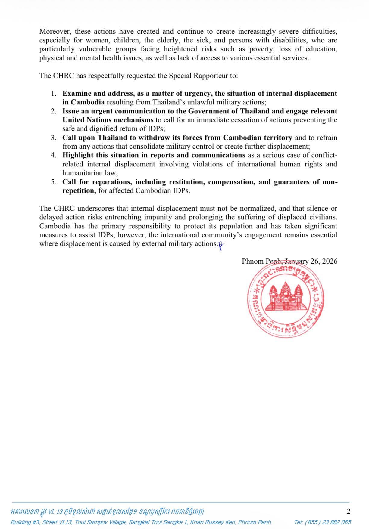 PHNOM PENH, Jan 26, 2026 — The Cambodian Human Rights Committee (CHRC) said it has submitted an urgent appeal to a United Nations special rapporteur over what it described as serious human rights violations against internally displaced persons (IDPs) in Cambodia linked to military actions by Thailand.