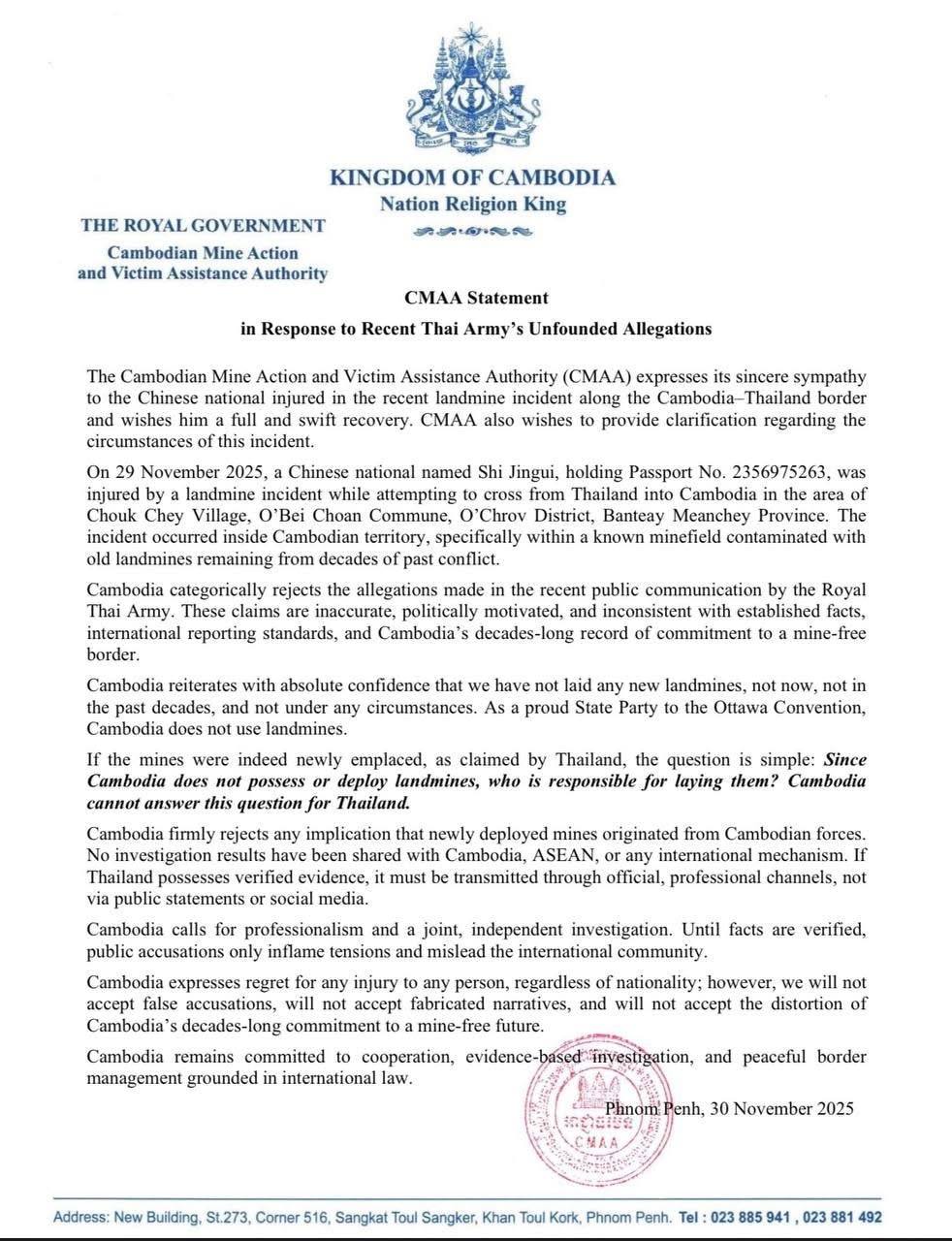 Phnom Penh, 30 November 2025 — The Cambodian Mine Action and Victim Assistance Authority (CMAA) has issued a strong rejection of recent accusations by the Royal Thai Army alleging the deployment of new landmines along the Cambodia–Thailand border.