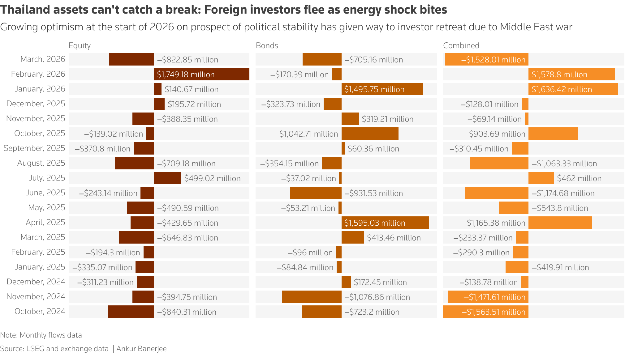 The outflows come after a brief rebound earlier in the year, when renewed investor confidence followed the election victory of Anutin Charnvirakul and expectations of political stability.
