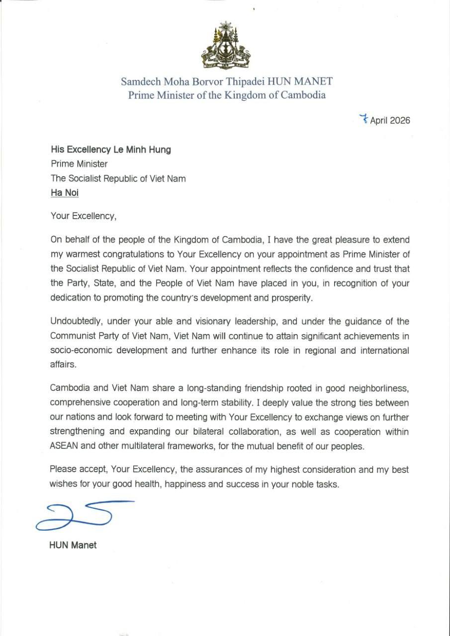 PHNOM PENH, April 9, 2026 — Cambodian Prime Minister Hun Manet has congratulated Le Minh Hung on his appointment as Prime Minister of Vietnam, reaffirming strong bilateral ties and a commitment to deeper cooperation.