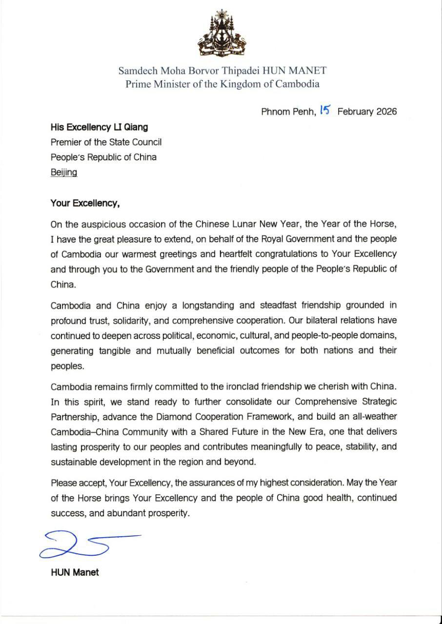 In a letter dated Feb. 15 marking the 2026 Chinese Lunar New Year, the Year of the Horse, Hun Manet said Cambodia remains firmly committed to what he described as an “ironclad friendship” with China.