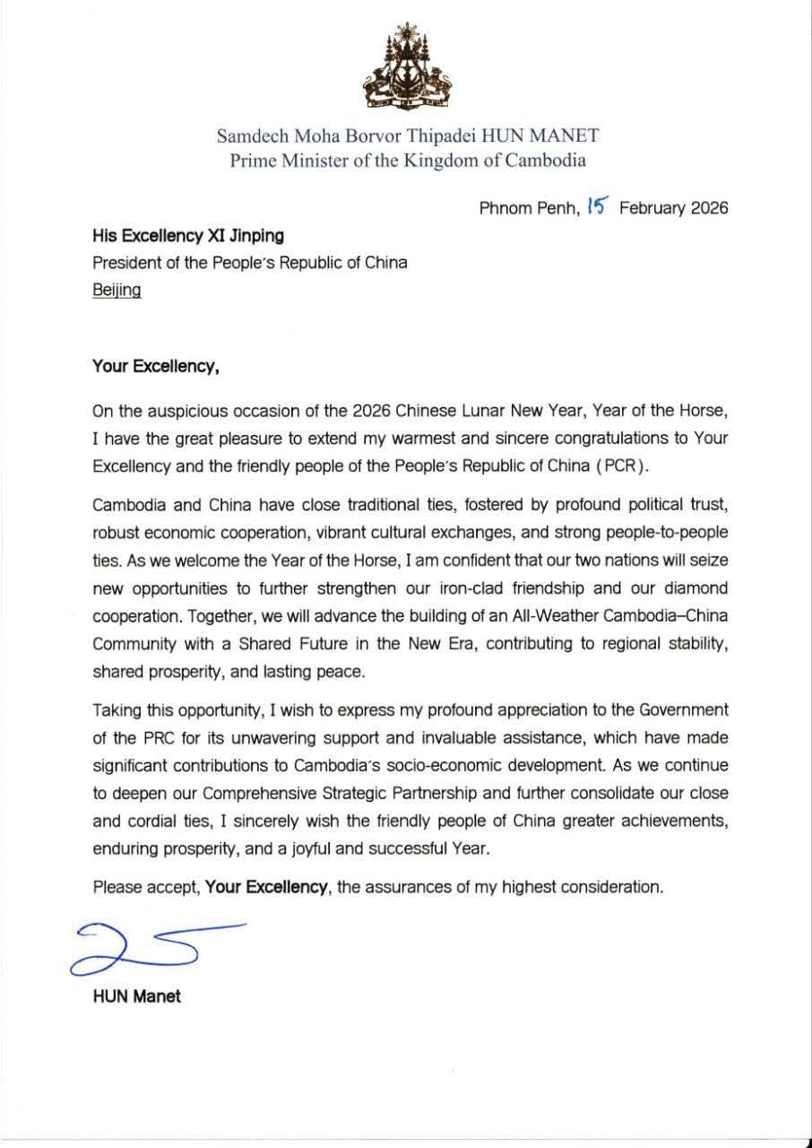 In a letter dated Feb. 15 marking the 2026 Chinese Lunar New Year, the Year of the Horse, Hun Manet highlighted close political trust, economic cooperation and cultural exchanges between Cambodia and China.