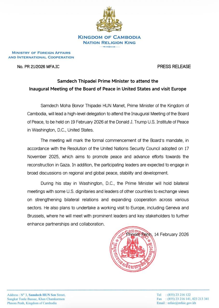 Phnom Penh, Feb. 14, 2026 — Cambodian Prime Minister Hun Manet will travel to the United States next week to attend the inaugural meeting of the Board of Peace before continuing on an official visit to Europe, the foreign ministry said on Saturday.