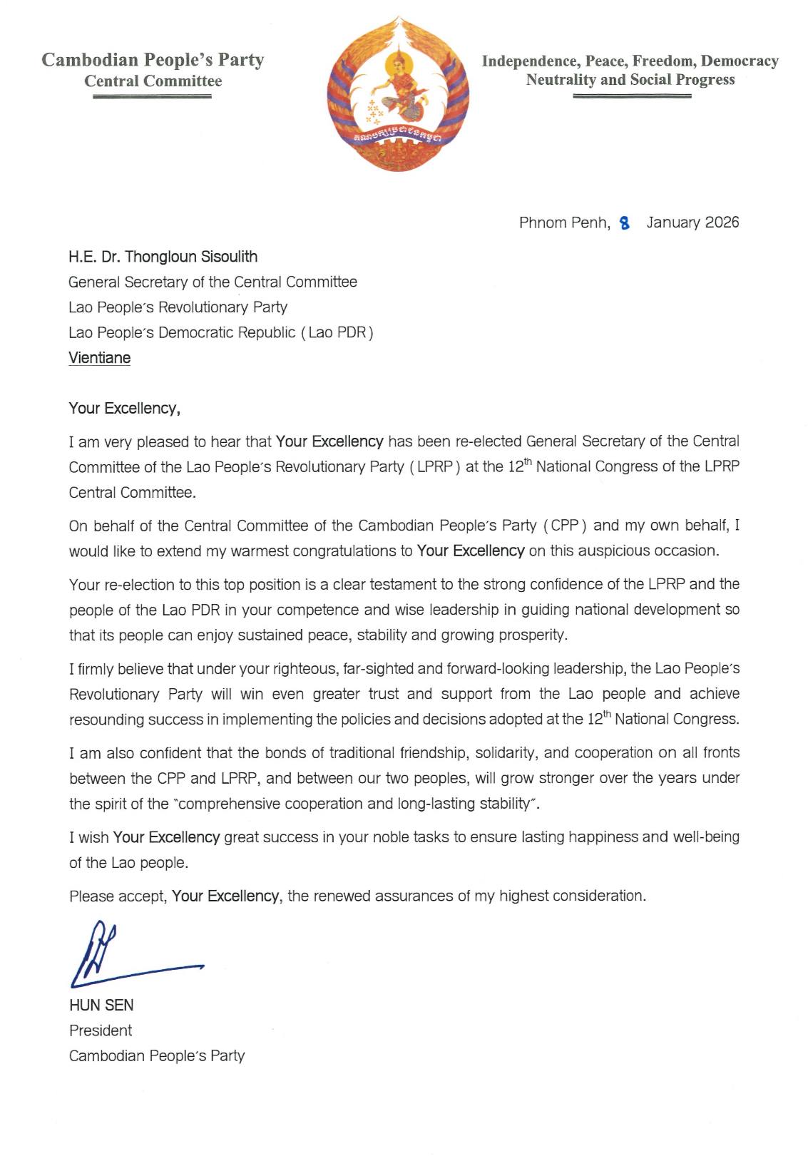 Phnom Penh, 8 January 2026 — The Central Committee of the Cambodian People’s Party (CPP) has extended its warmest congratulations to H.E. Dr. Thongloun Sisoulith on his re-election as General Secretary of the Central Committee of the Lao People’s Revolutionary Party (LPRP) at the 12th National Congress of the LPRP.