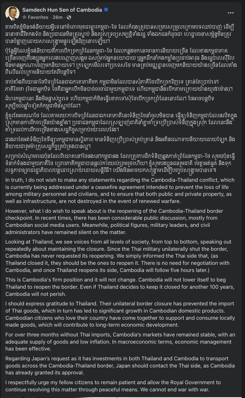 In his public remarks, Samdech Techo Hun Sen clarified that Cambodia has never requested the reopening of the checkpoint since its unilateral closure by the Thai military. “As Thailand closed the border, it is their decision to reopen it. Once Thailand reopens its side, Cambodia will follow within five hours,” he stated firmly.