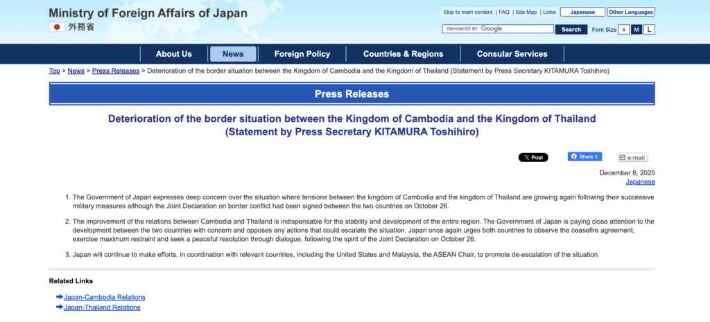 Tokyo, 8 December 2025 — The Government of Japan, via the Ministry of Foreign Affairs, has expressed serious concern over the renewed deterioration of the security situation along the border between the Kingdom of Cambodia and the Kingdom of Thailand, following successive military actions by both sides, despite the Joint Declaration on border conflict signed on 26 October.