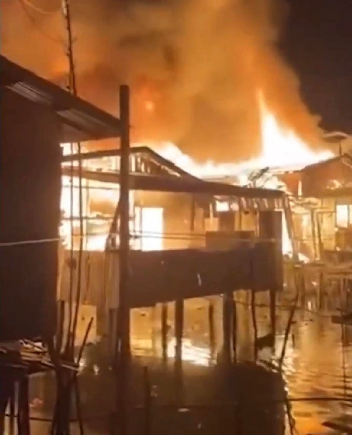 The fire rapidly spread through the densely packed waterside settlement, where many homes were built close together on stilts or floating structures, making firefighting efforts difficult.