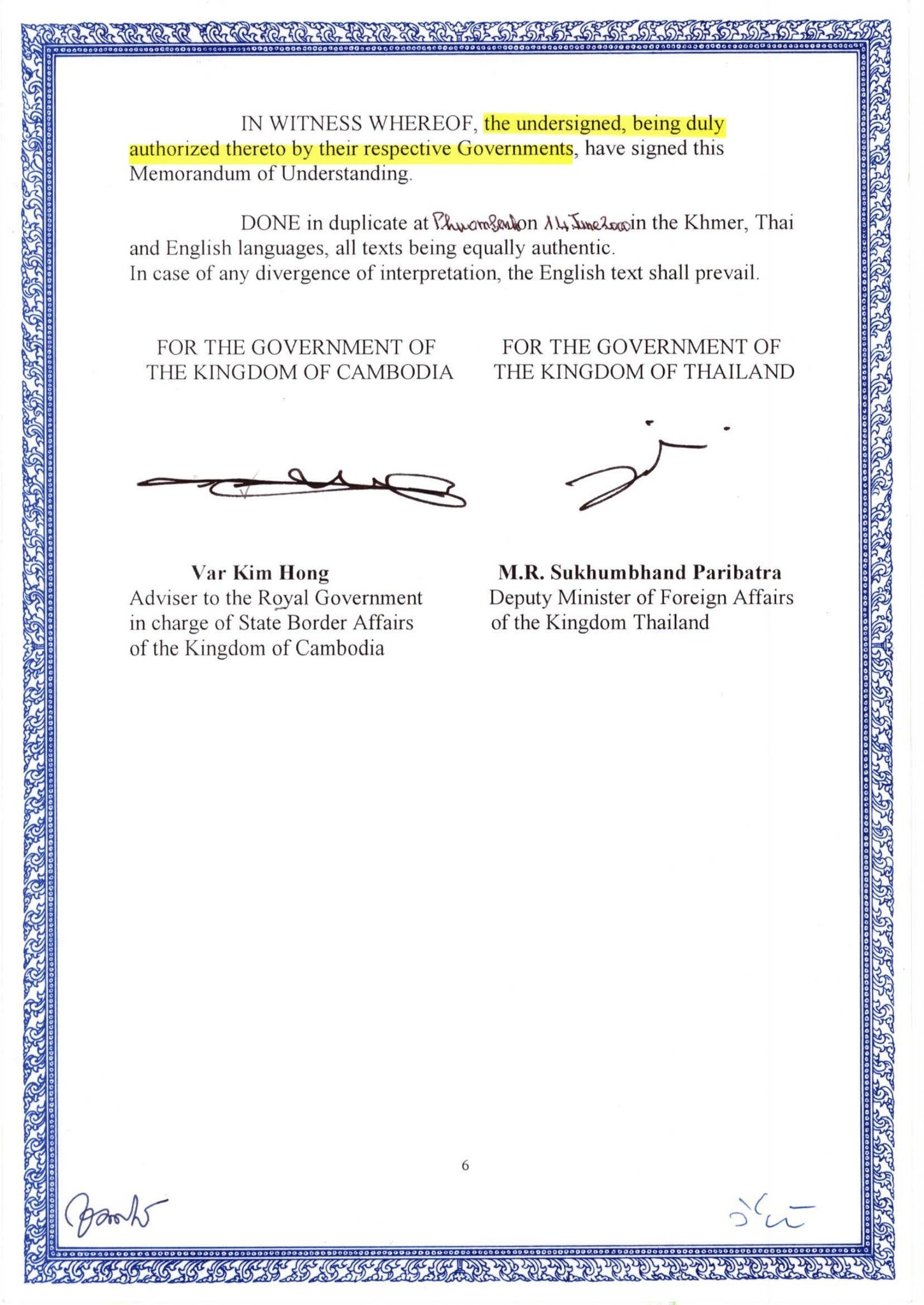 H.E. Seng Dyna concluded that the 2000 MoU remains fully in force and binding on both Cambodia and Thailand, and stressed that any attempt by one side to unilaterally withdraw would constitute a violation of international law.