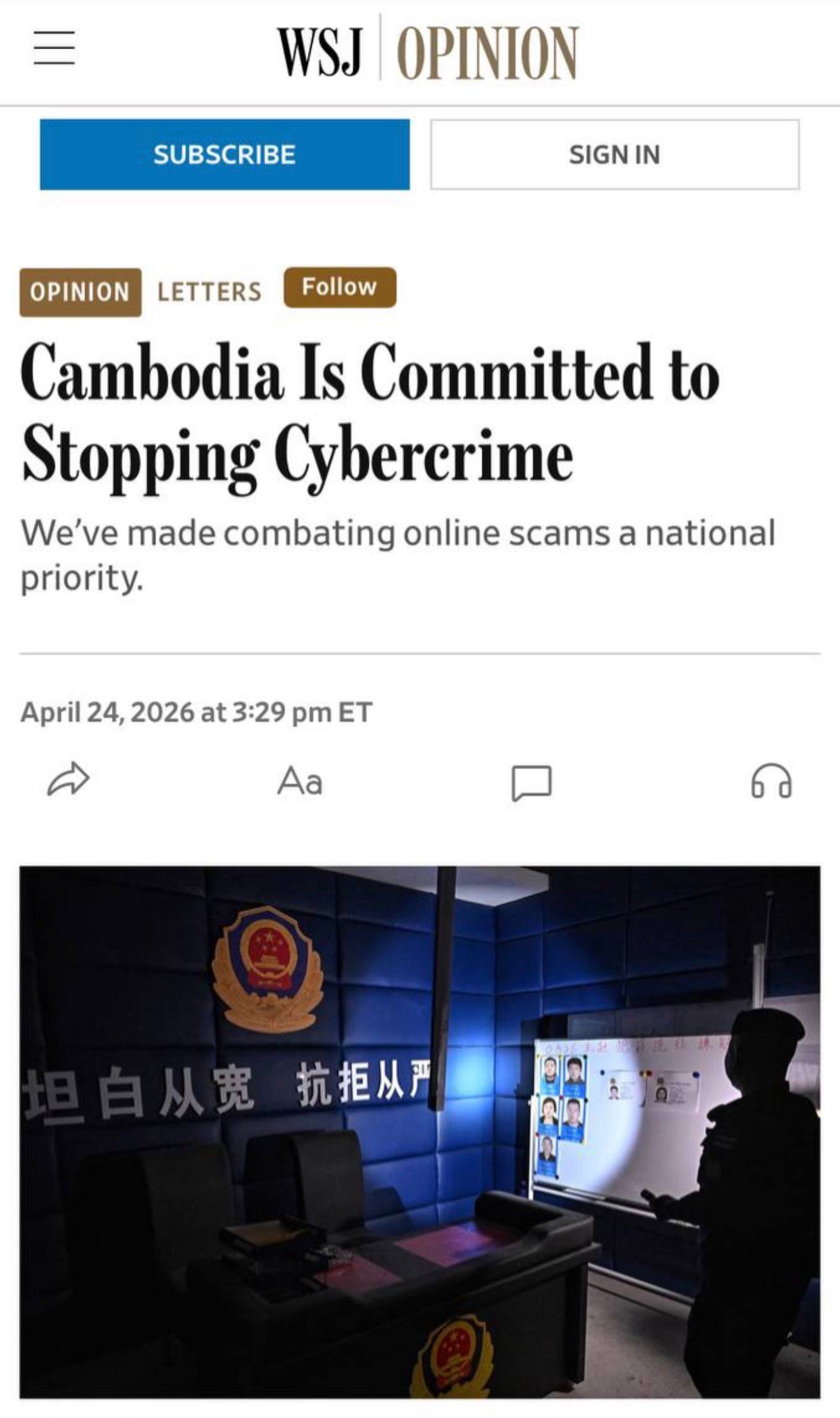 PHNOM PENH, April 25 — Cambodia said The Wall Street Journal had published an opinion article citing parts of a protest letter from its information minister after the newspaper used the term “Scambodia” in a report on cybercrime, but Phnom Penh said it would continue demanding the phrase be withdrawn.