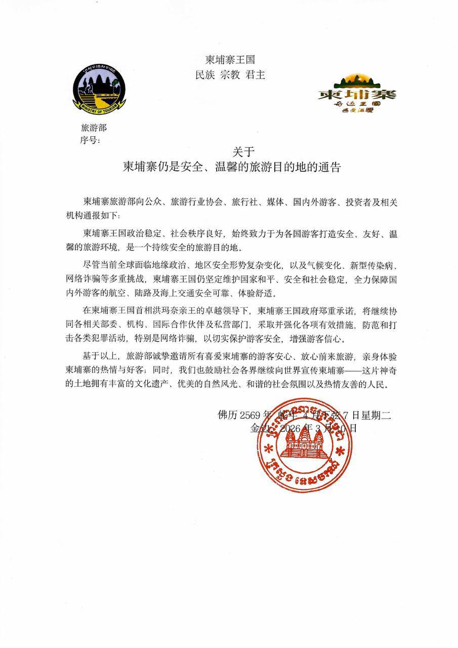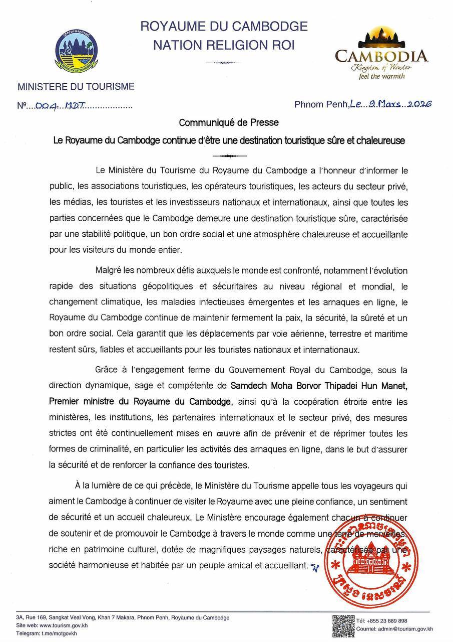 PHNOM PENH, March 11, 2026 — Cambodia remains a safe and welcoming destination for international travelers despite growing global challenges, the country’s Ministry of Tourism said on Wednesday.