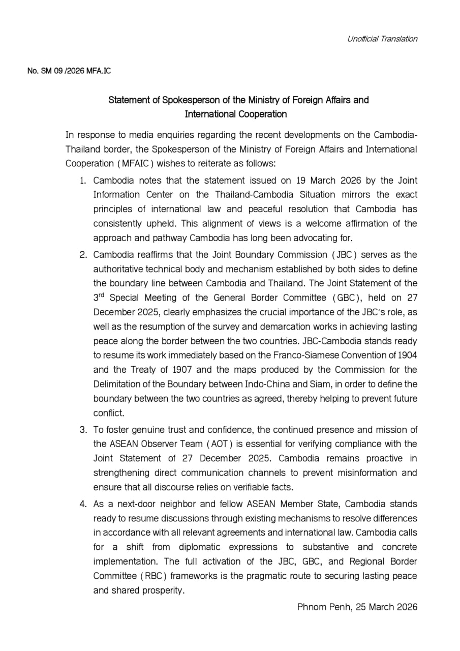 In a statement issued on March 25, the Ministry of Foreign Affairs and International Cooperation said recent positions expressed by Thailand’s Joint Information Center align with Cambodia’s long-standing approach of peaceful dispute resolution.