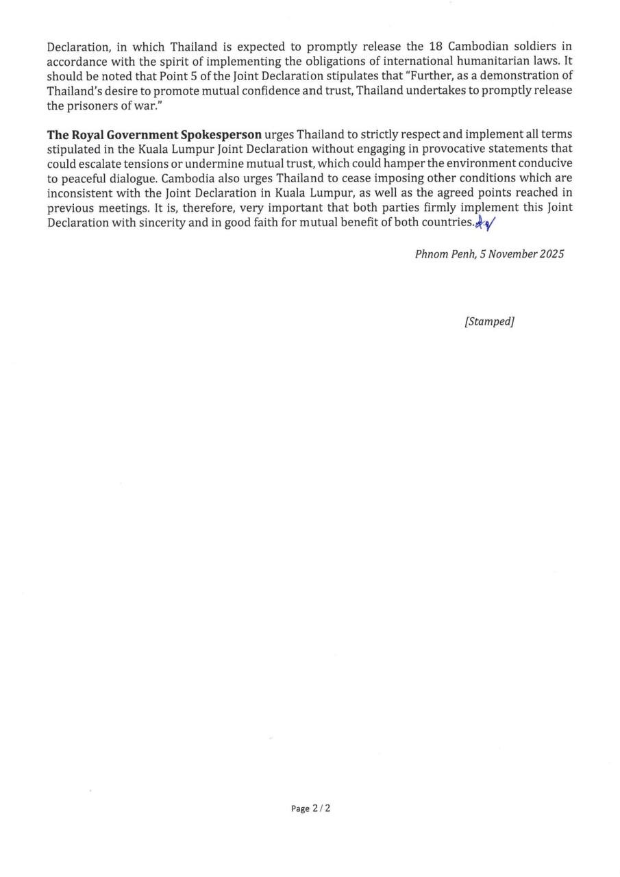 The Royal Government Spokesperson therefore urges Thailand to fully respect and implement all provisions of the Kuala Lumpur Joint Declaration in sincerity and good faith, and to refrain from provocative or misleading statements that may endanger the fragile progress achieved so far.