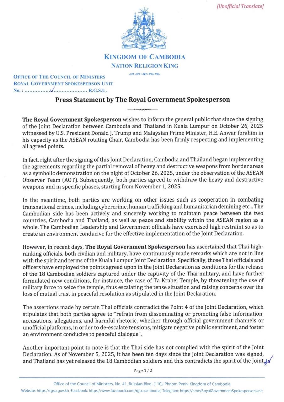 The Royal Government Spokesperson therefore urges Thailand to fully respect and implement all provisions of the Kuala Lumpur Joint Declaration in sincerity and good faith, and to refrain from provocative or misleading statements that may endanger the fragile progress achieved so far.