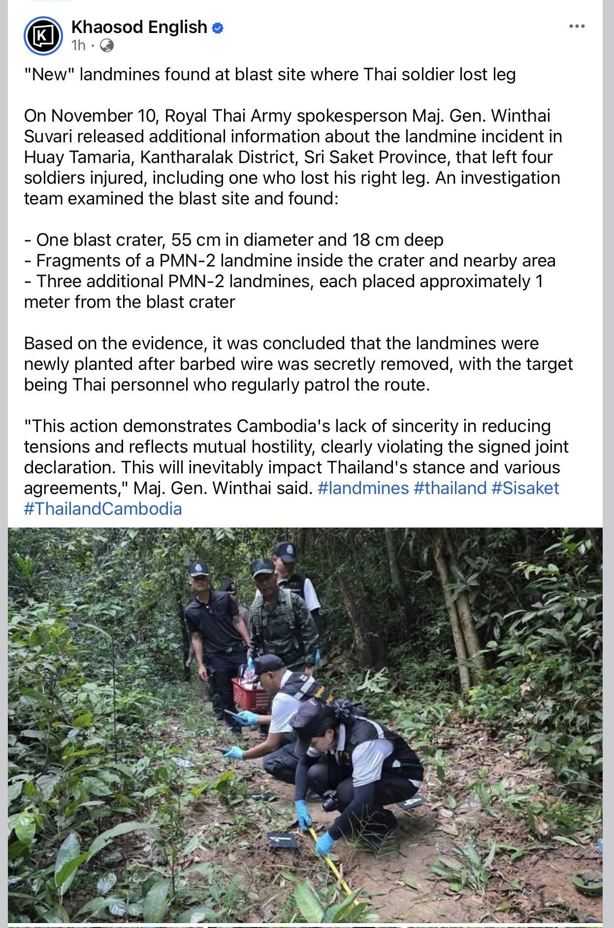 Fragments of a PMN-2 mine scattered around it. Three more devices found one meter away. Within the same day Maj. Gen. Winthai Suvari announced that the mines were newly planted, that barbed wire had been secretly removed, that Cambodia had acted with hostility and violated the peace declaration.