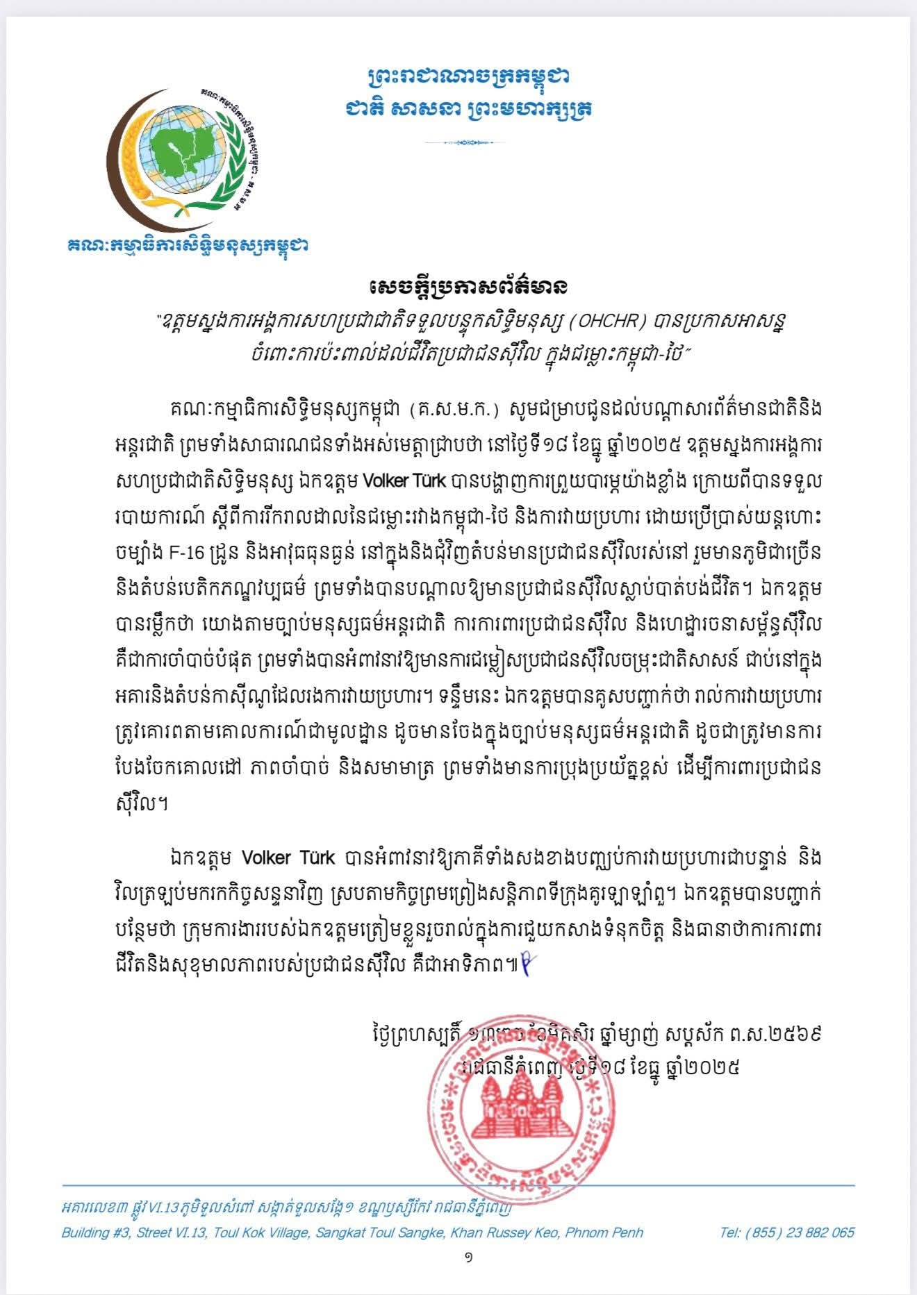 Phnom Penh, 18 December 2025 — The Cambodian Human Rights Committee (CHRC) has issued a press statement informing national and international media, as well as the public, that on 18 December 2025, the United Nations High Commissioner for Human Rights, H.E. Volker Türk, expressed grave concern over the escalating conflict between Cambodia and Thailand and its severe impact on civilian populations.