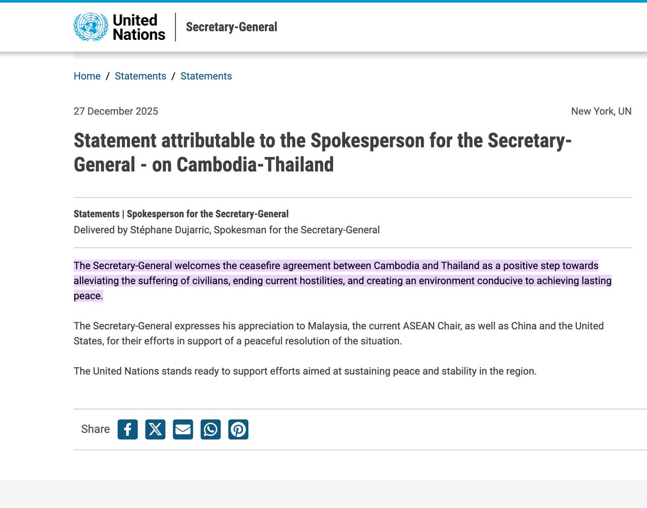 New York, 27 December 2025 — United Nations Secretary-General António Guterres has welcomed the ceasefire agreement between Cambodia and Thailand, describing it as a critical and positive step toward alleviating the suffering of civilians, halting ongoing hostilities, and fostering conditions conducive to the achievement of lasting peace along the shared border.