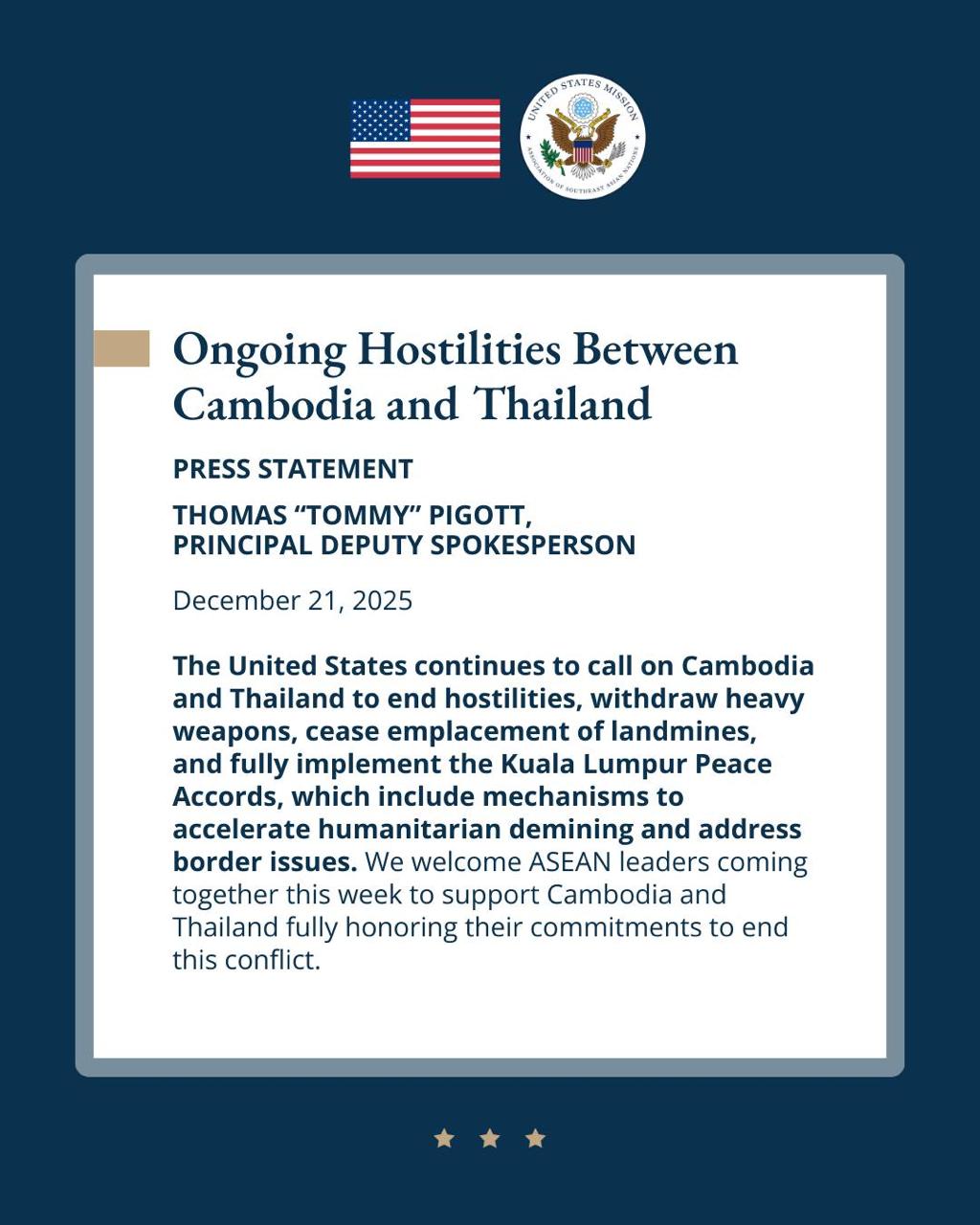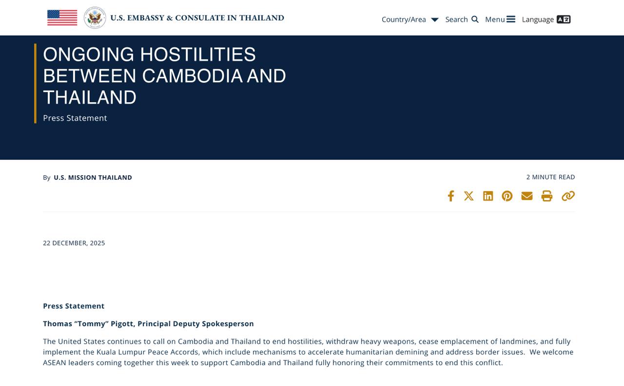 Washington, 21 December 2025 — The United States has once again urged Thailand and Cambodia to bring an immediate end to hostilities, withdraw heavy weaponry, halt the laying of landmines, and fully implement the Kuala Lumpur Peace Agreement, according to U.S. State Department Deputy Spokesperson Tommy Pigott.