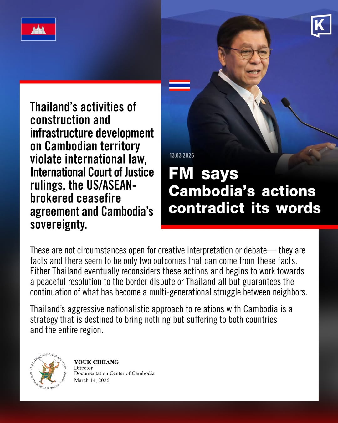 Chhang argued that the situation leaves two possible outcomes: either Thailand revises its actions and works toward a peaceful settlement of the border dispute, or tensions could persist for generations.